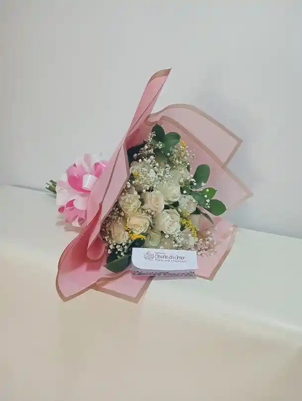 hermosisimo ramo de mano para esa persona ideal, rosas blancas, aster y rusco, lindo papel coreano, moño