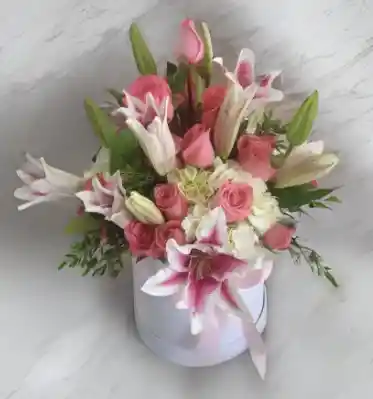 Hermosa caja de lirios y rosas rosadas especial para celebrar o felicitar. incluye tarjeta gratis.