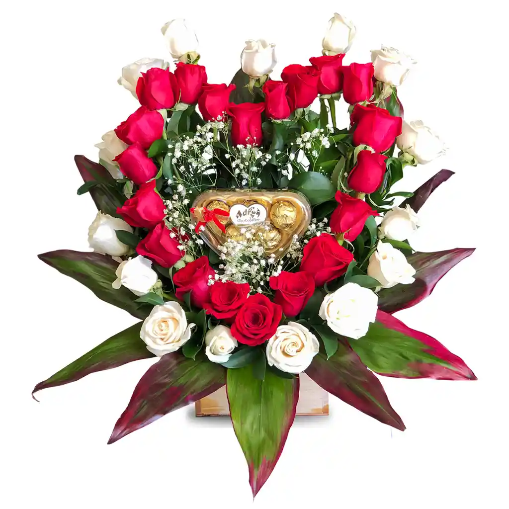 - Elaborado en 20 rosas rojas y 15 rosas blancas - Follaje en Gipsophyla, Rusco y Hoja de Carey - Chocolates x5