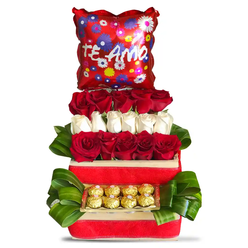 🌹- Arreglo elaborado en 10 Rosas rojas y 6 blancas. - Follaje en hoja de Dracena. - 1 globo y Chocolate ferrero x8 (sujeto a cambio según disponibilidad).🌹