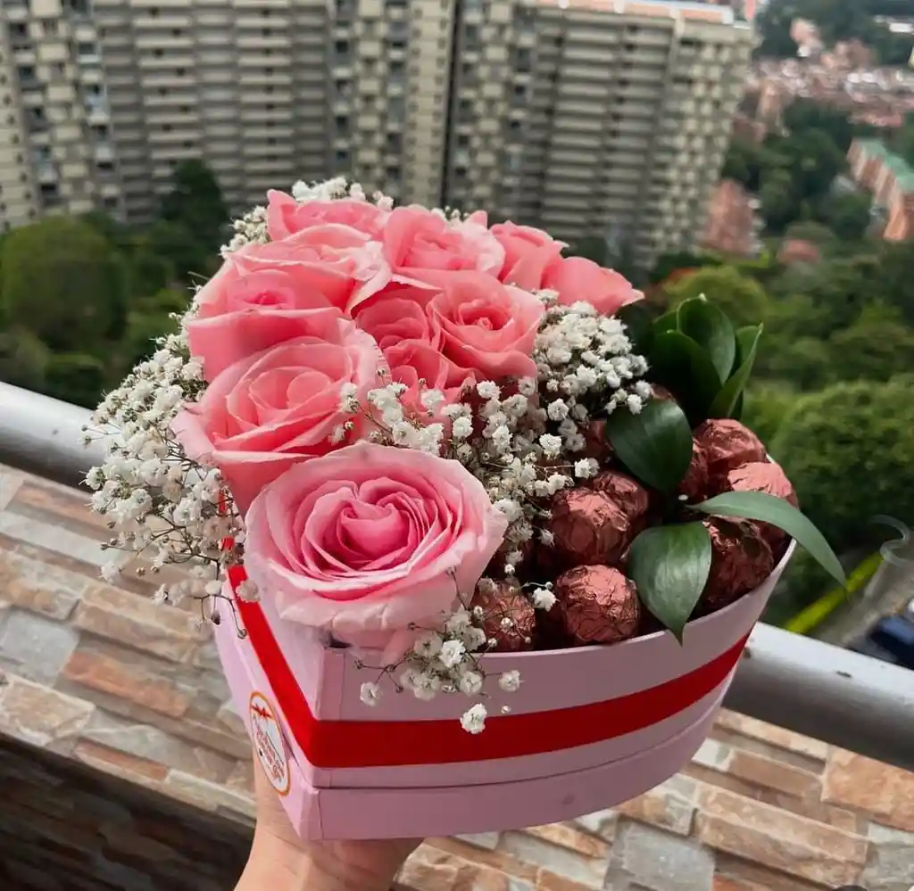 hermoso corazon con flores rosadas y chocolates, ideal para sorprender! pide el tuyo!