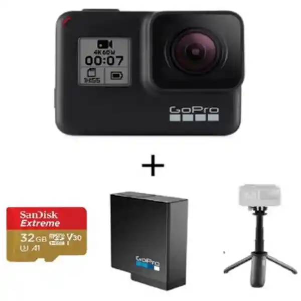 CONTENIDO DE LA CAJA. Cámara HERO7 Black x 1 Batería recargable x 2 Soporte adhesivo curvo x 1 Hebilla de montaje x 1 Cable USB-C x 1 Tornillo x 1 GoPro Shorty x 1 (Vara de extensión compacta y trípode) Micro SD Sandisk Extreme 32GB x 1