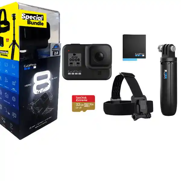 CONTENIDO DE LA CAJA. Cámara HERO8 Black x 1 Batería recargable x 2 Soporte adhesivo curvo x 1 Hebilla de montaje x 1 Cable USB-C x 1 Tornillo x 1 GoPro Shorty x 1 (Vara de extensión compacta y trípode) Correa para la cabeza y QuickClip x 1 Micro SD Sandisk Extreme 32GB x 1