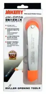 Descripción: "Herramientas punta + roller para desensamble JAKEMY / JM-OP06" Características: 1 Herramienta metálica con punta y rodillo de desensamble Longitud: 126 mm x ancho 26 mm USOS 1. Elaborada en acero liviano de alta resistencia y un rodillo de desensamble de plástico de alto impacto con diseño de ángulo oblicuo ultra fino que se pueden insertar fácilmente en pequeñas grietas. 3. Amplia mente recomendado para la reparación y el mantenimiento de equipos de comunicación, celulares, computadores, sonido, TV, etc. 4. Ensamble y desensamble de equipos electrónicos que requieran palas especiales. 5. Trabajos de bricolaje que requieran micro ensambles 6. En general es amplia mente recomendado para desensambles precisos evitando rayados accidentales y ruptura accidental de partes.