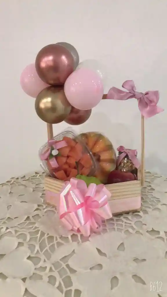 LA ANCHETA INCLUYE: -Base de madera hexagonal canasta (Globos réflex, látex y moño) -Canasta de frutas; ½ papaya, 1 piña, uvas, 2 peras, 2 manzana roja, 2 duraznos, ½ melón Según disponibilidad.