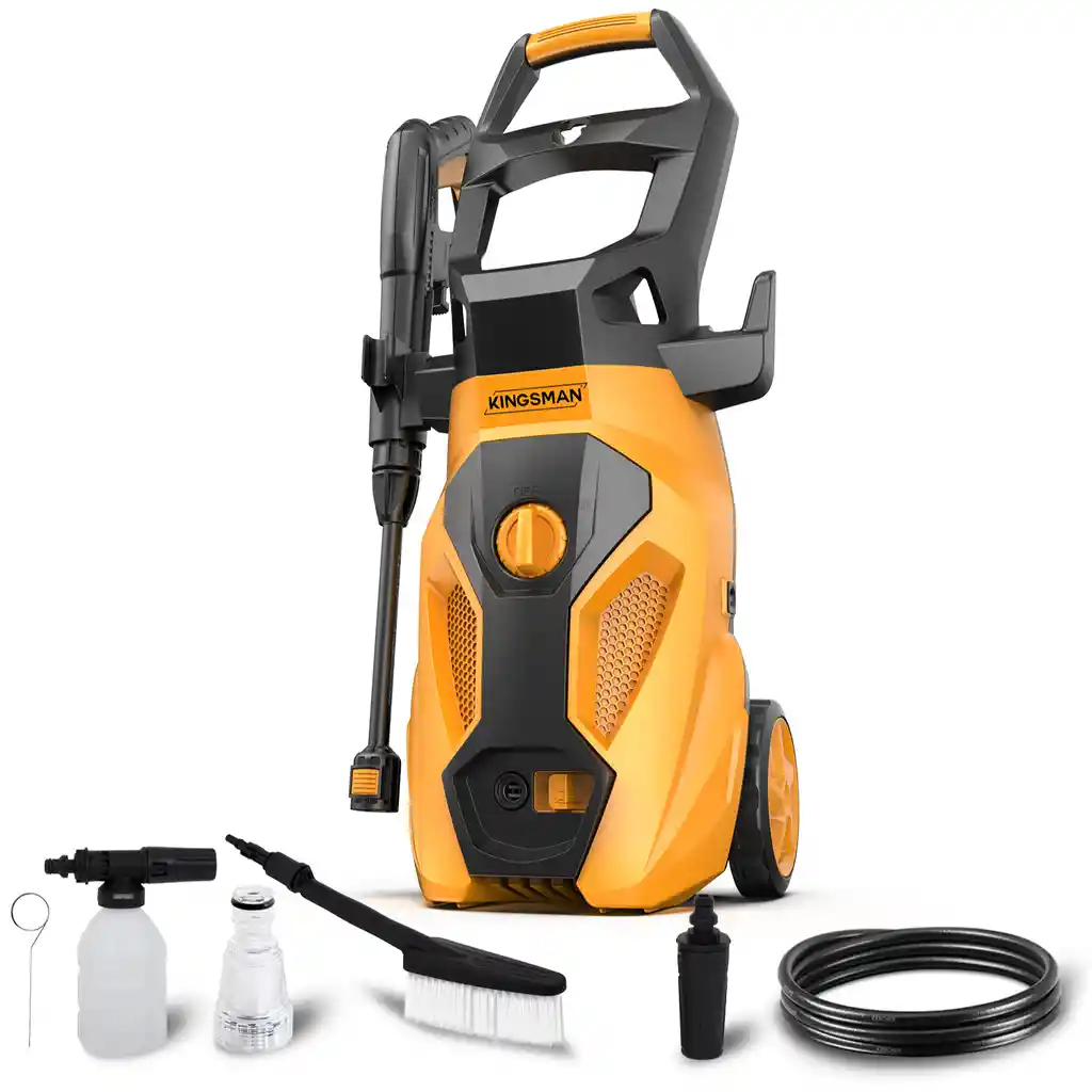 Remueve todo tipo de polvo, manchas y suciedad con esta potente hidrolavadora eléctrica Kingsman tipo Karcher y sé capaz de limpiar con agua a una máxima presión de 2000 PSI, autos, suelos, artículos de jardín y más. Una hidrolavadora que será tu aliada en esos trabajos de limpieza profunda. Optimiza el proceso de lavado con los prácticos accesorios como lo son el generador de espuma, cepillo de limpieza profunda y la boquilla de pulverización ajustable de la lanza. Cuenta con un sistema de apagado automático por lo que simplemente deja de apretar el gatillo e instantáneamente el motor parará sus funciones, además con el seguro de bloqueo que porta la pistola ten la plena confianza de dejarla reposando. Medidas generales (LxANxAL): 32.9x26x47 cm. Largo de manguera: 5 metros. Ahorra hasta 80 por ciento más agua que una manguera de riego común. Máxima presión de 2000 PSI. Caudal de agua: 6 litros por minuto. Voltaje: 120V/60 Hz. Watts: 1600. Peso del equipo: 6 kg. Incluye: 1 Hidrolavadora, 1 pistola de presión, 1 lanza con boquilla ajustable, 1 manguera, 1 cepillo con conector, 1 conector de entrada con filtro, 1 pasador de limpieza, 1 aplicador de jabón, 1 instructivo. 30 días de garantía por defecto de fabrica. No aplica por mal uso del producto. IMPORTADO POR SKYBRANDS COLOMBIA SAS / BY KINGSMAN