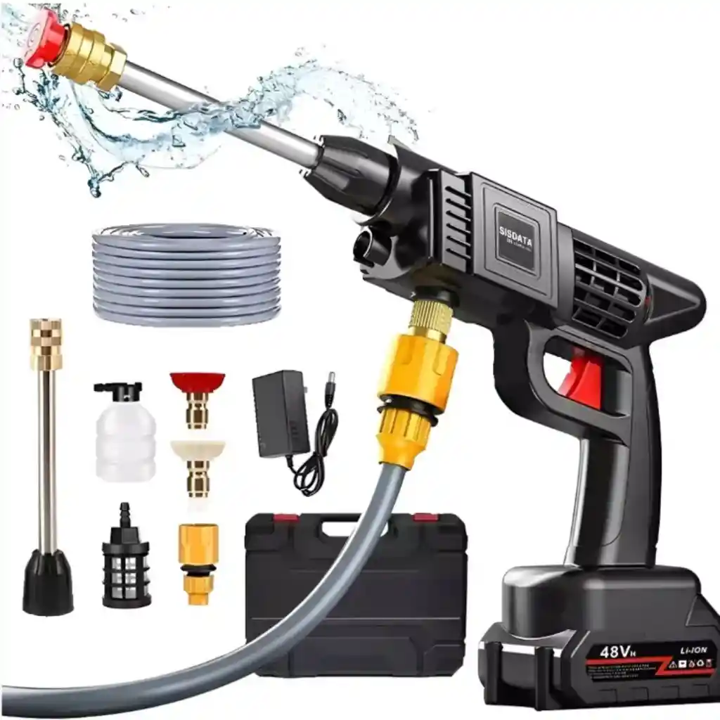 ¡Descubre la Hidrolavadora Inalámbrica Portátil, la solución perfecta para una limpieza eficiente y sin complicaciones! Este maletín completo con accesorios te ofrece una experiencia de lavado potente y práctica, ideal para uso en casa, jardín o cualquier espacio donde necesites un lavado rápido y efectivo. Características destacadas: Pistola inalámbrica para mayor comodidad y libertad de movimiento, sin enredos. Potencia de 300W con una presión de hasta 30 Bar, garantizando una limpieza profunda. Alcance de agua de hasta 5 metros, permitiendo llegar a los rincones más difíciles. Consumo eficiente de agua: 10 litros por minuto, cuidando tu recurso hídrico. Funciona sin necesidad de agua corriente, ideal para lugares sin acceso directo a la red. Material resistente y duradero: fabricado en ABS y cobre para mayor vida útil. Incluye batería de 2 x 48V y cargador para uso prolongado y recargas rápidas. Equipado con manguera, conectores, filtro de agua y recipiente para jabón, facilitando la aplicación de productos de limpieza o fumigación. Punteros angulares para ajustar la presión y el ángulo del agua según tu necesidad. Este conjunto viene en un maletín compacto y portátil, fácil de transportar y guardar. Perfecto para quienes buscan una hidrolavadora versátil, potente y sin complicaciones de cables o mangueras fijas. Ideal para: Lavar vehículos, motos, bicicletas y herramientas. Limpieza de patios, jardines y terrazas. Aplicación de productos de fumigación o limpieza con jabón. Uso en zonas rurales o urbanas sin acceso a agua corriente. No esperes más y aprovecha esta hidrolavadora inalámbrica que combina tecnología, potencia y practicidad en un solo equipo. ¡Haz tu compra ahora y lleva la limpieza a otro nivel!