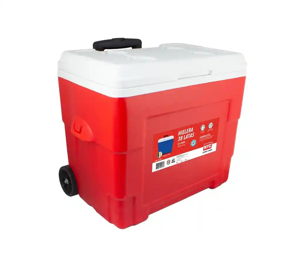La Nueva Hielera Nevera Sonora 32 Litros tipo maleta con llantas tiene un capacidad para 38 latas. Esta nevera te facilita el traslado de tus bebidas y alimentos. Con capacidad de 34 qt (38 latas), es ideal para tus viajes en familia o día de campo, incluye ruedas todo terreno, asa telescópica y su temperatura interna puede mantenerse hasta 26 horas. Cuenta recubrimiento interno de poliuretano. Su peso es de 4.130 kg y sus DIMENSIONES 49 × 36 × 44 cm. Características -Capacidad de almacenamiento: 38 latas | 32 Litros y peso: 4.130 kg. -Recubrimiento interno de poliuretano. -Capacidad de almacenar hasta 45 latas + Hielo. -Mantiene las bebidas frías por hasta 26 horas