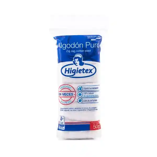 Algodón HIGIETEX 100 % puro, suave y absorbente, ideal para el cuidado diario de la piel y múltiples usos de higiene personal. Su textura delicada lo hace perfecto para limpiar, desmaquillar, aplicar productos cosméticos, realizar curaciones básicas y cuidados infantiles.
