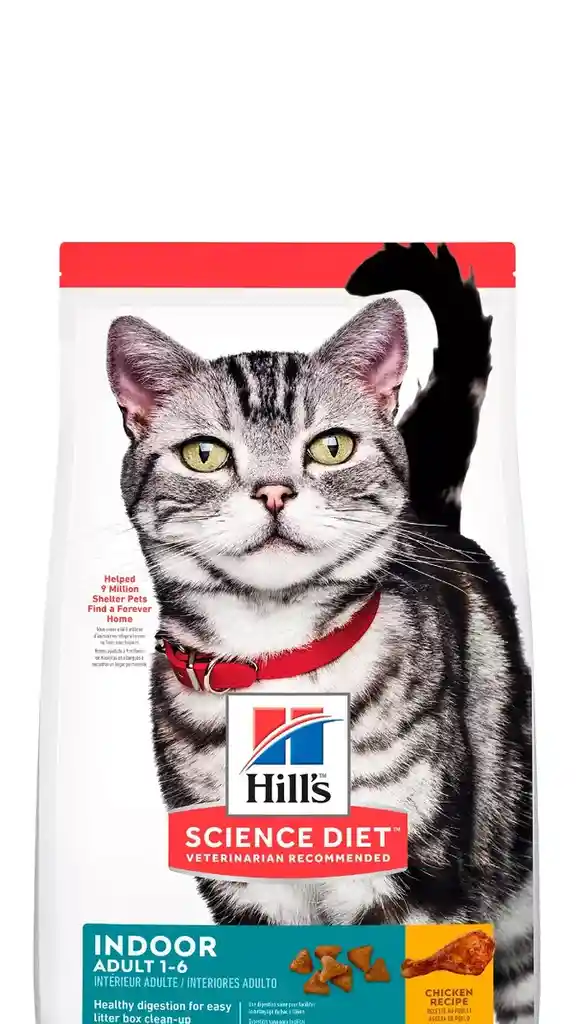 El alimento para gatos Hills Science Diet Adult Indoor proporciona nutrición completa para gatos adultos con un estilo de vida de interiores. Sabor / Color Pollo Composición y/o Material Pollo (carne, piel), trigo entero, harina de gluten de maíz, celulosa en polvo, grasa de pollo, gluten de trigo, harina de pollo (carne), saborizante de hígado de pollo, pulpa de remolacha desecada, aceite de soya, sulfato de calcio, ácido láctico, aceite de pescado, cloruro de potasio, sal yodada, cloruro de colina, vitaminas (complemento de vitamina e, l-ascorbil-2-polifosfato (fuente de vitamina c), complemento de niacina, mononitrato de tiamina, complemento de vitamina a, pantotenato de calcio, complemento de riboflavina, biotina, complemento de vitamina b12, clorhidrato de piridoxina, ácido fólico, complemento de vitamina d3), taurina, l-carnitina, l-lisina, minerales (sulfato ferroso, óxido de zinc, sulfato de cobre, óxido manganoso, yodato de calcio, selenito de sodio), tocoferoles mixtos para la frescura, sabores naturales (romero, té verde, menta verde), guisantes verdes, manzanas, arándanos, zanahorias, brócoli, beta caroteno. Análisis Garantizado Proteína cruda Min. 31% (310g/kg) Grasa cruda Min. 13% (130g/kg) Fibra cruda Min. 6% (60g/kg) Fibra cruda Max. 12% (120g/kg) Humedad Max. 8% (80g/kg) Vitamina E Min. (500 UI/kg) Vitamina C Min.( 85 mg/kg) Recomendación de uso Alimento balanceado de mantenimiento para gatos adultos de 1-6 años de edad con estilo de vida de interiores. Almacenar en un lugar fresco y seco. Consulte al médico veterinario. Beneficios 1. Proteína de alta calidad para el correcto funcionamiento del sistema musculoesquelético 2.Fibras naturales que apoyan el buen funcionamiento del tracto digestivo 3. Alto contenido de fibra que genera sensación de saciedad en la mascota