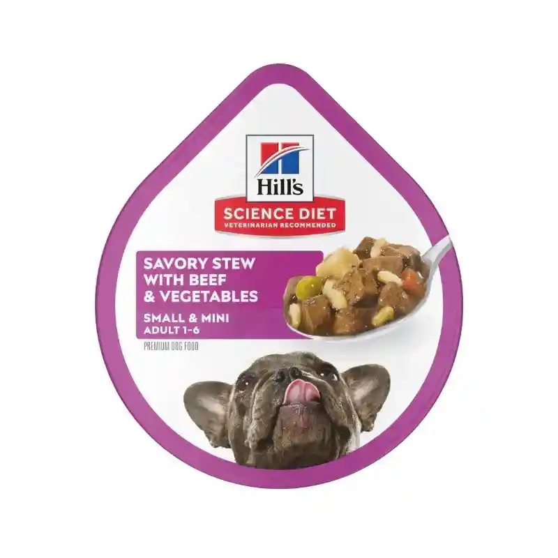 Elige el sabor. Hill's Science Diet Adult Small & Mini es el alimento húmedo perfecto para cuidar la salud y el bienestar de tu perro de raza pequeña. Con una sabrosa mezcla de carne real, arroz integral y verduras, este estofado ofrece una nutrición equilibrada y deliciosa, todo en un conveniente formato de 99 gramos.