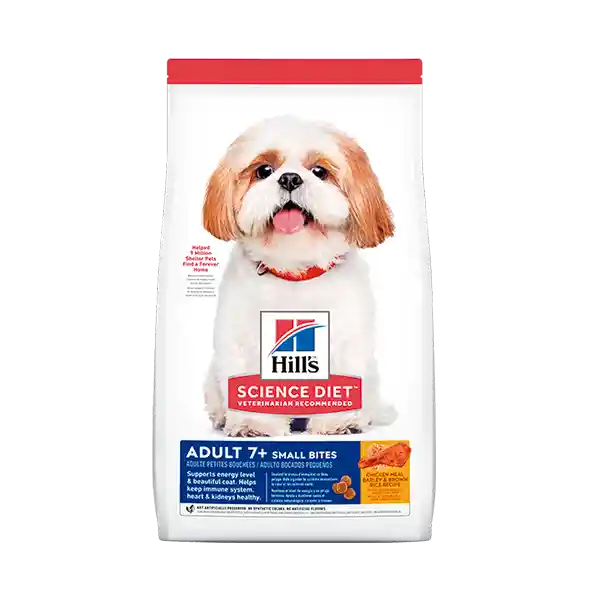 El alimento seco para perros Hill’s® Science Diet® Adult 7+ Small Bites está formulado para necesidades específicas del envejecimiento. Proporciona nutrición fácil de digerir con una mezcla sinérgica de ingredientes para ayudar a favorecer el nivel de energía y actividad. Delicioso sabor pollo en un bocado de tamaño pequeño para aquellos que prefieren la variedad. Minerales balanceados para la salud del corazón y riñones Omage-6 y vitamina E para una piel y pelaje hermosos Proteína de alta calidad para músculos magros