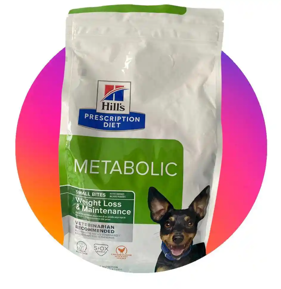 Nutrición clínicamente probada para ayudar a los perro a perder peso de forma natural al activar su metabolismo. Como la epidemia en humanos, casi el 50% de la población de mascotas tiene exceso de peso. Inclusive un poco de peso de más puede impactar en la calidad de vida de la mascota y su relación con la familia porque puede reducir el tiempo de juego, impactar en su movilidad y la salud de su perro a largo plazo. Los nutriólogos y veterinarios de Hill’s desarrollaron la nutrición clínica Prescription Diet® Metabolic, formulado especialmente para apoyar en el manejo del peso de su perro. De hecho, el 88% de los perros perdieron peso en casa en 2 meses con la nutrición de Metabolic. Beneficios Trabaja naturalmente con el metabolismo único de su mascota. Evita la recuperación del peso después de perderlo. Ayuda a que la mascota se sienta llena y satisfecha entre comidas. Apoya la vitalidad y una salud holística. Trigo entero, maíz entero, harina de pollo, celulosa en polvo, harina de soya, harina de gluten de maíz, pulpa de remolacha desecada, pulpa de tomate desecada, sabor pollo hidrolizado, grasa de pollo, linaza, aceite de coco, ácido láctico, DL-metionina, L-lisina, zanahorias, cloruro de potasio, sal yodada, ácido lipoico, vitaminas (complemento de vitamina E, L-ascorbil-2-polifosfato (fuente de vitamina C), complemento de niacina, mononitrato de tiamina, complemento de vitamina A, pantotenato de calcio, complemento de riboflavina, biotina, complemento de vitamina B12, clorhidrato de piridoxina, ácido fólico, complemento de vitamina D3), cloruro de colina, minerales (sulfato de manganeso, sulfato ferroso, óxido de zinc, sulfato de cobre, yodato de calcio, selenito de sodio), taurina, L-carnitina, tocoferoles mixtos para la frescura, sabores naturales, beta caroteno. Alimentacion_text Proteína cruda Mín.24% Grasa cruda Mín. 9% Fibra cruda Máx. 15% Humedad Máx. 10% Alimento balanceado coadyuvante en el tratamiento de sobrepeso, obesidad y mantenimiento de peso para perros adultos. Usar solo según lo indique su veterinario. Almacenar en un lugar fresco y seco.