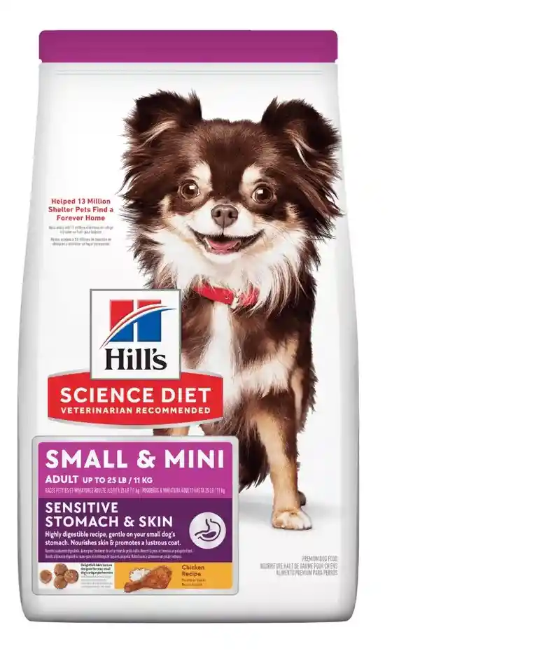 Hill´s Adult Sensitive Stomach Skin , es un alimento indicado para perros adultos de rezas pequeñas con sistema digestivo sensible (heces flojas ocasionales, molestias estomacales o problemas para tolerar el alimento actual). Contiene Vitamina E y Omega 6 que ayudan a nutrir y cuidar la piel. Libre de sabores y conservantes artificiales. Propiedad Especificación Etapa Adulto Sabor / Color Pollo Composición y/o Material Pollo, arroz de cerveceros, harina de pollo, guisantes amarillos, cebada perlada rajada, sorgo integral, producto de huevo, grasa de pollo, aceite de soja, arroz integral, pulpa de remolacha seca, sabor a hígado de pollo, ácido láctico, sabor a hígado de cerdo, cloruro de potasio, linaza , vitaminas (suplemento de vitamina E, L-ascorbil-2-polifosfato (fuente de vitamina C), suplemento de niacina, mononitrato de tiamina, suplemento de vitamina A, pantotenato de calcio, suplemento de riboflavina, biotina, suplemento de vitamina B12, clorhidrato de piridoxina, ácido fólico, vitamina Suplemento D3), sal yodada, cloruro de colina, taurina, minerales (sulfato ferroso, óxido de zinc, sulfato de cobre, óxido manganoso, yodato de calcio, selenito de sodio), tocoferoles mixtos para la frescura, fibra de avena, sabores naturales, betacaroteno, manzanas, Brócoli, zanahorias, arándanos, guisantes verdes. Análisis Garantizado Proteína 26.0% Grasa 15.9% Carbohidratos / NFE 51.4 Fibra cruda 1.3% Calcio 0.97% Fósforo 0.79% Potasio 0.74% Sodio 0.29% Magnesio 0.099% Recomendación de uso Alimento balanceado de mantenimiento especifico en estomago y piel sensible para perros de 1-6 años. Almacenar en un lugar fresco y seco. Consulte al médico veterinario Beneficios 1. Fibras prebióticas que favorecen la digestión y formación de heces consitentes. 2. Vit. E y C que promueven el desarrollo del sistema inmune. 3. Omega 6 para fortalecer la barrera de defensas de la piel y mejorar calidad del pelaje Garantía del vendedor: 30 días