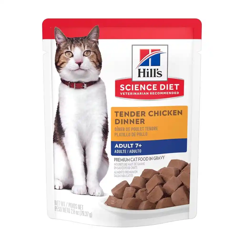 El alimento húmedo en pouch para gato senior sabor platillo de pollo Hill’s Science Diet Adult 7+ a partir de siete años de edad ofrece una experiencia culinaria exquisita con trozos deliciosos en una irresistible salsa. Esta suave comida para gato, con ingredientes de la más alta calidad, está diseñada para satisfacer los paladares más exigentes y proporcionar la nutrición premium que los gatos senior necesitan. Ideal para gatos mayores de 7 años, este concentrado para gato puede servirse como una comida independiente o mezclarse con su alimento seco Hill’s Science Diet.