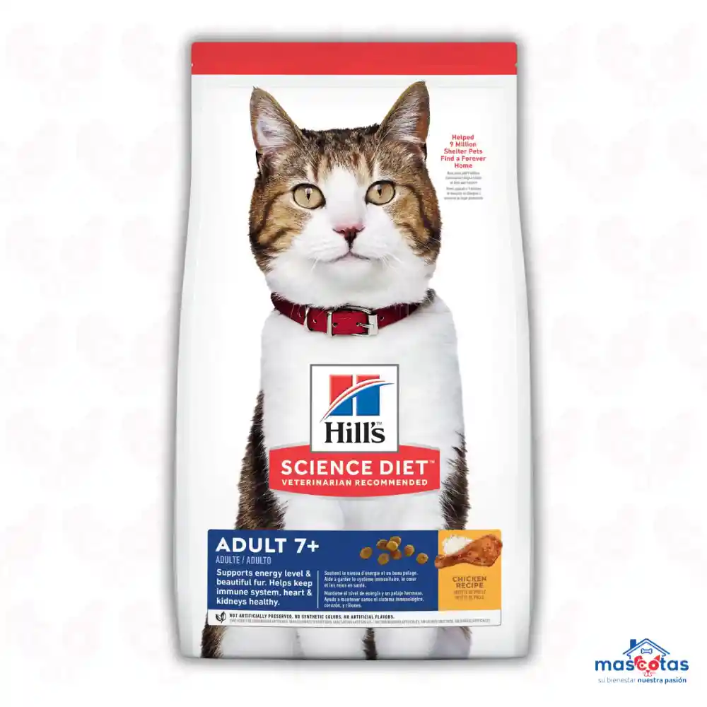 Science Diet. El Alimento Para Gato Senior Hills Science Diet Adult 7 + a Partir de Siete Años de Edad Está Diseñado Para Promover el Envejecimiento Digno y Saludable de tu Gato. Con Una Mezcla Sinérgica de Ingredientes, Este Concentrado Para Gato Fomenta el Nivel de Energía y Actividad en Los Gato Mayores, Asegurando Que Disfruten de Una Vida Plena y Activa. Gracias a la Ciencia, Hills Science Diet Proporciona Una Nutrición Óptima y Equilibrada Que Apoya el Bienestar Integral de tu Gato Senior Con Múltiples Beneficios:- Taurina Esencial Para la Salud Del Corazón y Minerales Balanceados Que Ayudan a Mantener en Buen Estado Los Riñones y la Vejiga.- Vitamina E y Ácidos Grasos Omega-3 y -6 Que Contribuyen a Una Piel Saludable y un Pelaje Hermoso, Manteniendo a tu Gato Con Una Apariencia Radiante.- Ingredientes Fáciles de Digerir y Fibras Naturales Que Promueven Una Digestión Sana, Asegurando Que tu Gato Procese Sus Alimentos de Manera Eficiente.- Formulado Específicamente Para Gato Mayores, Ofreciendo la Nutrición Adecuada Para Apoyar un Estilo de Vida Activo y Saludable. Hills Science Diet es la Marca Más Recomendada Por Veterinarios en Eua. Taurina y Minerales Para un Corazón, Vejiga y Riñones Sanos. Ingredientes Fáciles de Digerir. Vitamina E, Omega 3S y 6S Para un Pelaje Radiante. Pollo, Trigo Entero, Harina de Gluten de Maíz, Grasa de Pollo, Arroz de Cervecería, Pulpa de Remolacha Desecada, Saborizante de Hígado de Pollo, Sulfato de Calcio, Ácido Láctico.