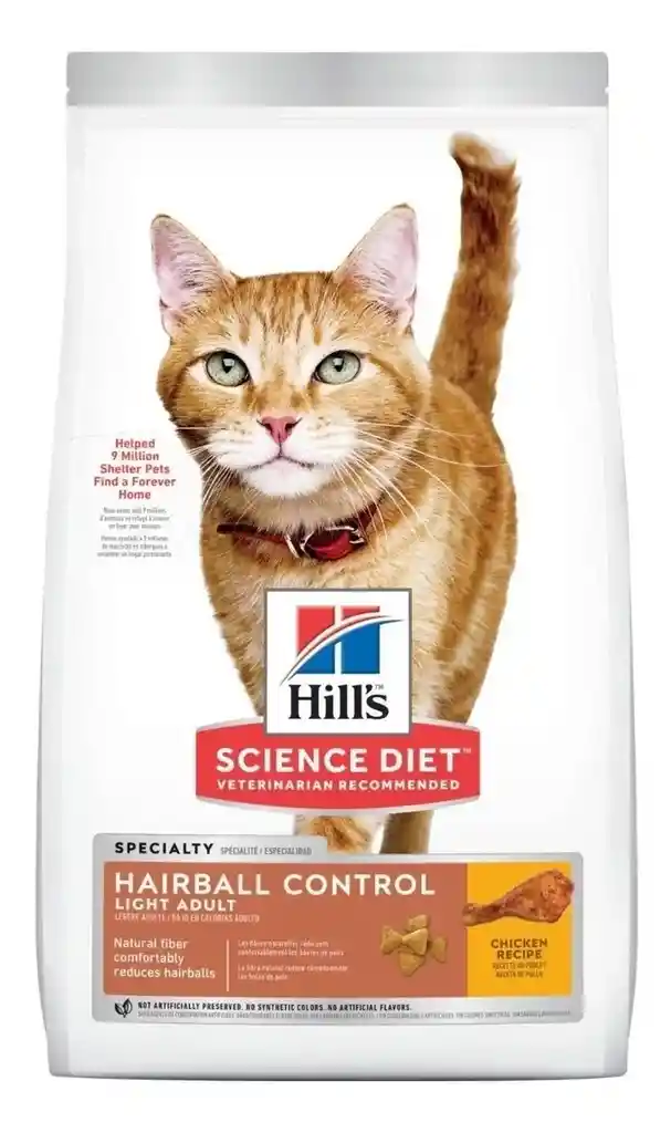 Hills Hairball Control Light es un alimento seco enriquecido con fibra natural que ayuda a evitar la formación de bolas de pelo. Reducido en un -14% de calorías que Hill’s® Adult Hairball Control. Beneficios antioxidantes clínicamente probados. Sin colorantes, sabores o conservantes artificiales. Propiedad Especificación Sabor / Color Pollo Composición y/o Material Pollo, harina de gluten de maíz, arroz de cerveza, gluten de trigo, celulosa en polvo, trigo integral, sabor a hígado de pollo, pulpa de remolacha seca, aceite de soja, sulfato de calcio, ácido láctico, grasa de pollo, cloruro de potasio, fosfato dicálcico, cloruro de colina, sal yodada , Aceite de pescado Análisis Garantizado PROTEÍNA CRUDA 32.0% min GRASA CRUDA 6.0% min FIBRA CRUDA 5.5% min FIBRA CRUDA 10.0% máx. HUMEDAD 10.0% max VITAMINA E 500 UI / kg min ÁCIDO ASCÓRBICO (VITAMINA C) 85 mg / kg min Contenido calórico: 279 kcal / taza Beneficios Las fibras naturales trabajan para reducir cómodamente las bolas de pelo para un gato más feliz. Ayuda a evitar el aumento de peso excesivo y contiene un 14% menos de calorías que la receta de Control de bolas de pelo para adultos. La combinación de antioxidantes y vitaminas trabaja en conjunto para ayudar a mantener un sistema inmunológico saludable. Garantía del vendedor: 30 días