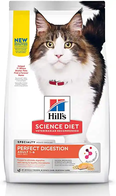 El alimento Perfect Digestion de Hill's para gatos adultos de 1 a 6 años ayuda a mantener la digestión de tu mascota en equilibrio. Este producto es una opción para los dueños de mascotas que desean apoyar el bienestar y el microbioma digestivo promoviendo la regularidad y la calidad de las heces con el apoyo de la tecnología ActivBiome y fibras nutritivas.