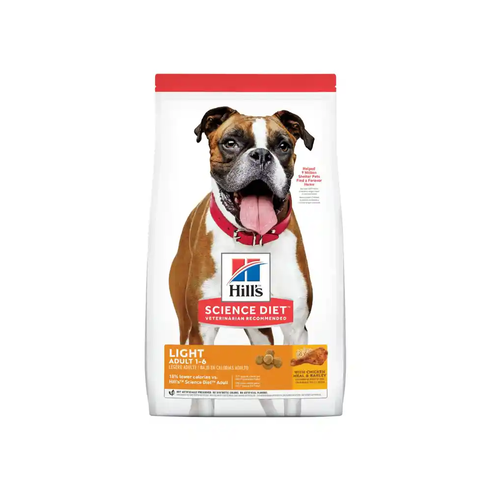El alimento seco para perros Hill's Science Diet Adult Light es nutrición precisa para perros adultos menos activos que requieren un alimento bajo en calorías para mantener un peso y estilo de vida sanos. Delicioso sabor pollo para aquellos que prefieren la variedad. Se recomienda para: Perros adultos de 1-6 años de edad que requieren menos calorías (i.e. perros que son menos activos, esterilizados o propensos al aumento de peso).