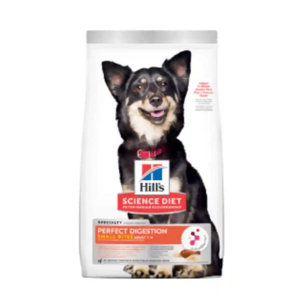 Hill’s Science Diet Perfect Digestion para perros adultos razas pequeñas de 1 a 6 años, indicado para equilibrar rápidamente el microbioma intestinal de la mascota por su combinación de prebióticos Características Presentación: 3.5 lb Tipo de Alimento: Seco