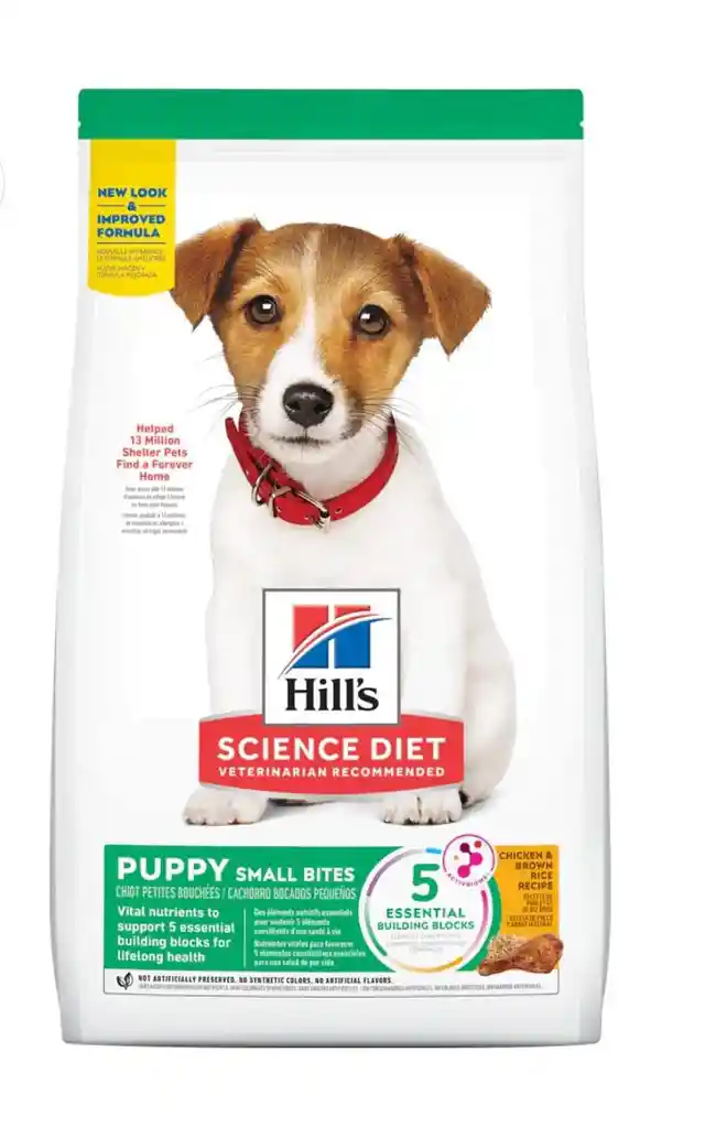 El alimento seco Hill’s® Science Diet® Small Bites Puppy está cuidadosamente formulado para las necesidades de desarrollo de los cachorros, y así tener el mejor comienzo en la vida y crecer a su máximo potencial. Delicioso sabor del pollo en un bocadito pequeño para aquellos que prefieren la variedad. DHA de aceite de pescado para el sano desarrollo del cerebro y los ojos Proteína de alta calidad para desarrollar músculos magros Minerales balanceados para huesos y dientes fuertes Se recomienda para: Cachorros de hasta 1 año de edad y perras gestantes o lactantes.