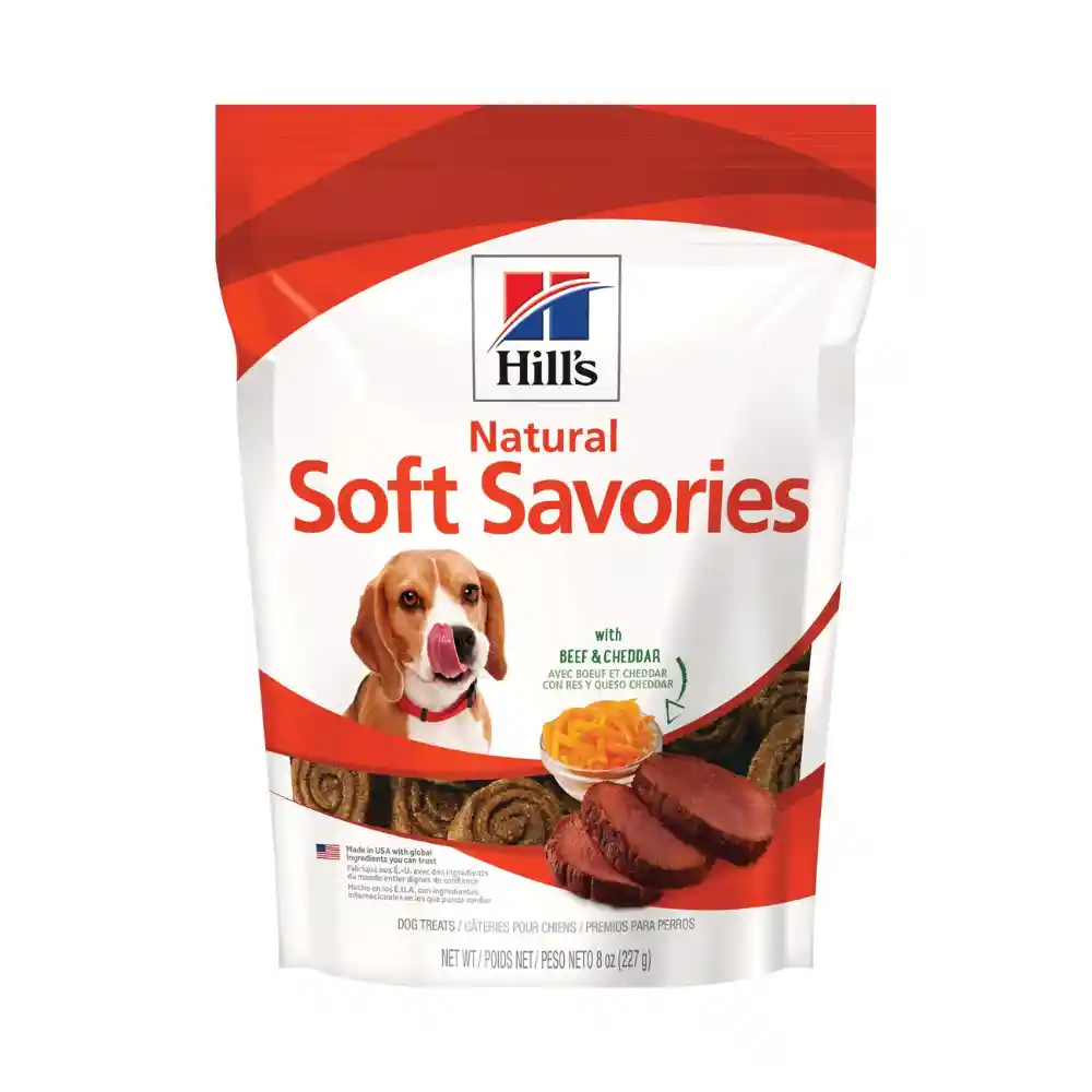 Las golosinas para perros Hill's Natural Soft Savories con Res y Queso Cheddar son deliciosas, naturales y están hechas solo con los mejores ingredientes. La textura suave y tierna combinada con una mezcla de ricos y divertidos sabores hará feliz a un perro. Sin sabores ni conservantes artificiales. TAMAÑO DE LA RAZA Raza pequeña, Raza mediana, Raza grande ETAPA DE VIDA Adulto
