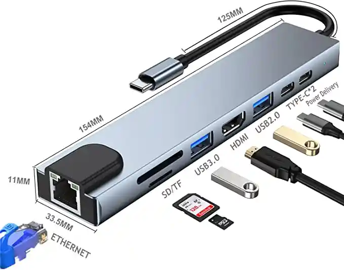 concentrador USB-C 8 en 1: convierte un solo puerto USB-C en seis puertos y dos ranuras para transferencia de datos, expansión de pantallas, conexión a internet y carga Video Ultra HD: el puerto HDMI emite resoluciones de hasta 4K@30Hz a una pantalla conectada carga conveniente: el puerto de entrega de energía USB de 100 w mantiene su MacBook Pro de 15 pulgadas con Thunderbolt 3 u otro portátil compatible completamente cargado (utilizando el adaptador de alimentación original de su dispositivo) mientras utiliza todas las demás funciones del concentrador transferencia de datos rápida y conexión de red: dos puertos USB 3.1 Gen 1 (USB 3.0) y uno USB 2.0 y ranuras para tarjetas SD y microSD soportan velocidades de transferencia de datos de hasta 5Gbps. el puerto Gigabit Ethernet admite velocidades de red de 10/100/1000Mbps