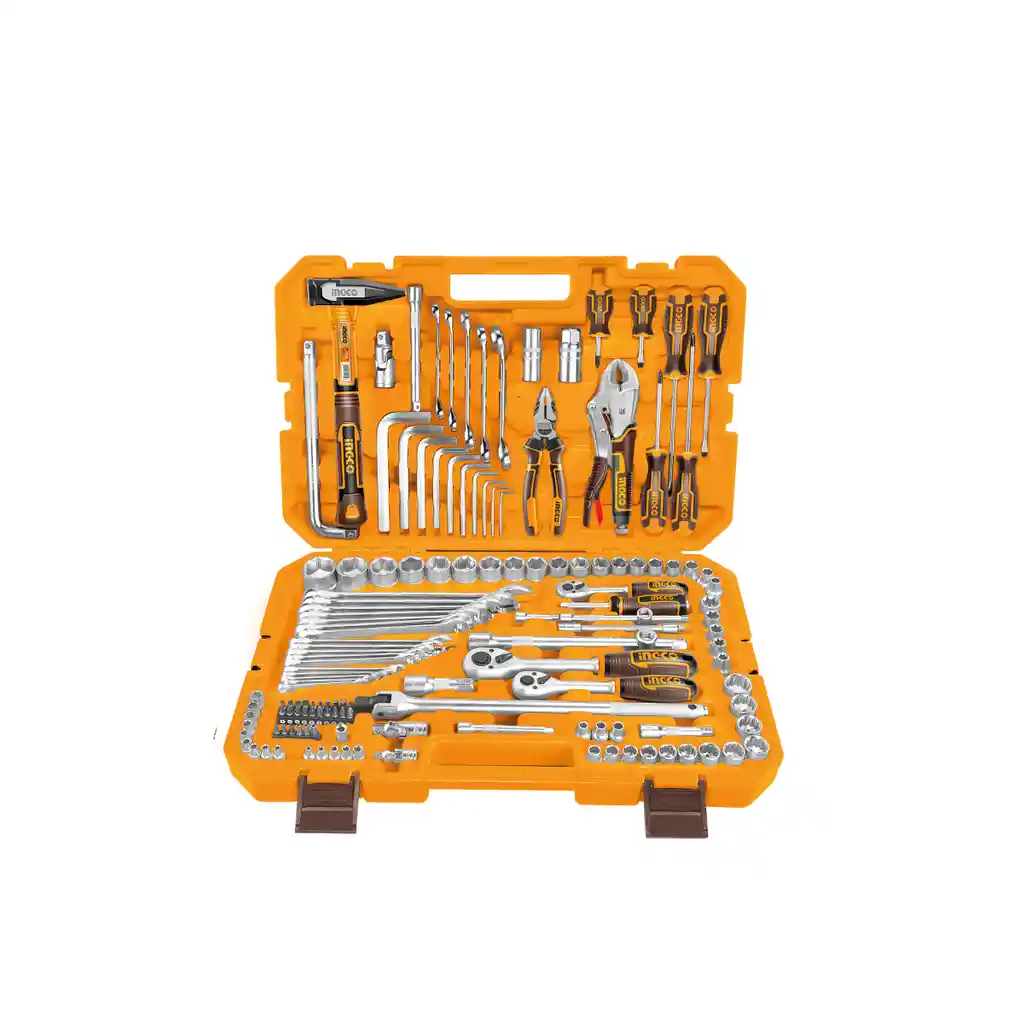 Juego de herramientas combinadas de 142 piezas Incluir: 1/2 "DR.Part : Enchufe hexagonal de 19 piezas 1/2 ": 8-10-12-13-14-15-16-17-18-19-20-21-22-23-24-25-27-30-32MM Enchufe de estrella de 5 piezas 1/2 ": E10 12 14 16 20 Mango Dr.Flex de 1Pz 1/2 ", 375MM 1 llave de trinquete de 1/2 ", 45 dientes Barra de extensión de 2 piezas 1/2 ": 75 mm (3") 250 mm (10 ") Junta universal Dr. 1Pcs 1/2 " Adaptador de tres vías 1Pcs 1/2 "(F) * 3/8" (M) 2Pcs Toma de bujía 1/2 "Dr.16MM y 21MM Mango de 1 pieza 1/2 "* 10" L DR.Part de 3/8 ": 15 piezas 3/8 "Dado de 12 puntos: 6-7-8-9-10-11-12-13-14-15-17-18-19-21-22 Llave de trinquete de 1Pcs 3/8 ", 45T 2 piezas de barra de extensión de 3/8 ": 75 mm (3") 150 mm (6 ") 1Pcs 3/8 "Dr. Junta universal DR de 1/4 "Parte: 26 piezas 1/4 "* 25 MM puntas de destornillador: PH0-PH1-PH2-PH3-PZ0-PZ1-PZ2-PZ3-SL4-SL5.5-SL7 H2-H3-H4-H5-H6-H7-H8-H10 , T10H-T15H-T20H-T25H-T27H-T30H-T40H Soporte de puntas 1Pcs 9 piezas de dado hexagonal de 1/4 ": 4-4.5-5-5.5-6-7-8-9-10 Enchufe de estrella de 5 piezas 1/4 ": E4 5 6 7 8 1 llave de trinquete de 1/4 ", 45 dientes Barra de extensión de 3 piezas 1/4 ": 50 mm (2") 100 mm (4 ") 150 mm (6") Junta universal Dr. 1Pcs 1/4 " Adaptador de tres vías 1Pcs 3/8 "(F) * 1/4" (M) Mango giratorio de 1 pieza 1/4 "* 150 mm 1 barra de extensión flexible de 1/4 "* 150 mm Otras herramientas Llave combinada de 17 piezas: 6-7-8-9-10-11-12-13-14-15-16-17-18-19-21-22-24 Llave de tuerca abocinada de 5 piezas: 8 * 10-10 * 12-11 * 13-12 * 14-17 * 19 Llave hexagonal de 10 piezas: 2.5-3-4-5-6-7-8-10-12-14MM 1 martillo de maquinista de 300g 1 pieza de alicates combinados de 7 " 1 llave de bloqueo de mandíbula curva de 10 " Destornillador ranurado S2 de 2 piezas: SL6.5 * 100 SL6.5 * 150 Destornillador Phillips S2 de 2 piezas: PH2 * 100 PH2 * 150 Destornillador rechoncho de 2 piezas: PH2 * 38 SL6.5 * 38 Empacado por BMC ©2019-2024 ToGroup All rights reser