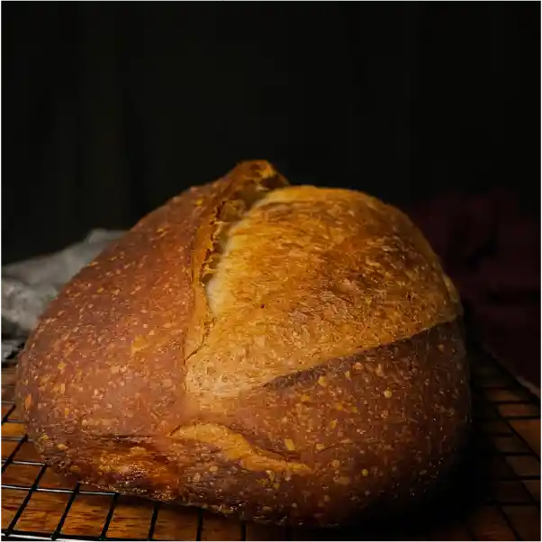 Es el típico pan de masa madre o Sourdough. Pan artesanal en el cual resalta el sabor del trigo. Pan con fermentación mínimo de 12 horas en pieza.