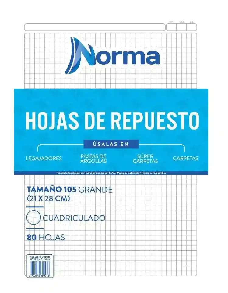 HOJAS DE REPUESTO CUADRICULADAS PARA CARPETA LEGAJADORA. TAMAÑO 105 GRANDE. MEDIDAS 21 X 28 CM. PAQUETE X 80 HOJAS. MARCA NORMA.