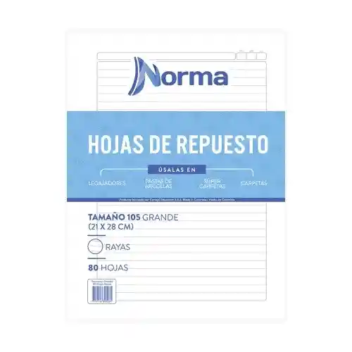 HOJAS DE REPUESO RALLADAS PARA CARPETA LEGAJADORA. TAMAÑO 105 GRANDE. MEDIDAS 21 X 28 CM. PAQUETE X 80 HOJAS. MARCA NORMA.