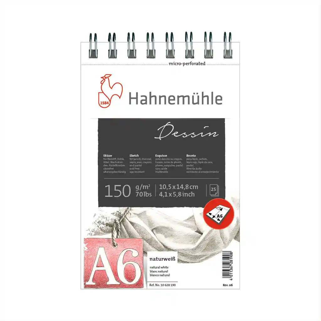 Dessin dibujo blanco | HahnemühleEl papel parece muy liso y, sin embargo, muestra un granulado fino que garantiza una adhesión excelente del color. El tono blanco natural del papel permite plasmar marcados contrastes y colores con una gran intensidad. Los artistas que usan el papel para bocetos Dessin elogian su capacidad de absorción del color que impide que se desprendan los pigmentos no fijados. Está disponible en cinco formatos. El nuevo «tamaño del bolsillo» A6 es idóneo, en particular, para plasmar las impresiones que los artistas quieren conservar sobre la marcha.Los blocs con espiral cuentan con una microperforación que permite separar las hojas sin que se note el borde perforado. Las hojas tienen el formato DIN indicado en cada caso. Sin ácidos y resistente al paso del tiempo.Calidad, buen servicio y precio justo!butaca art