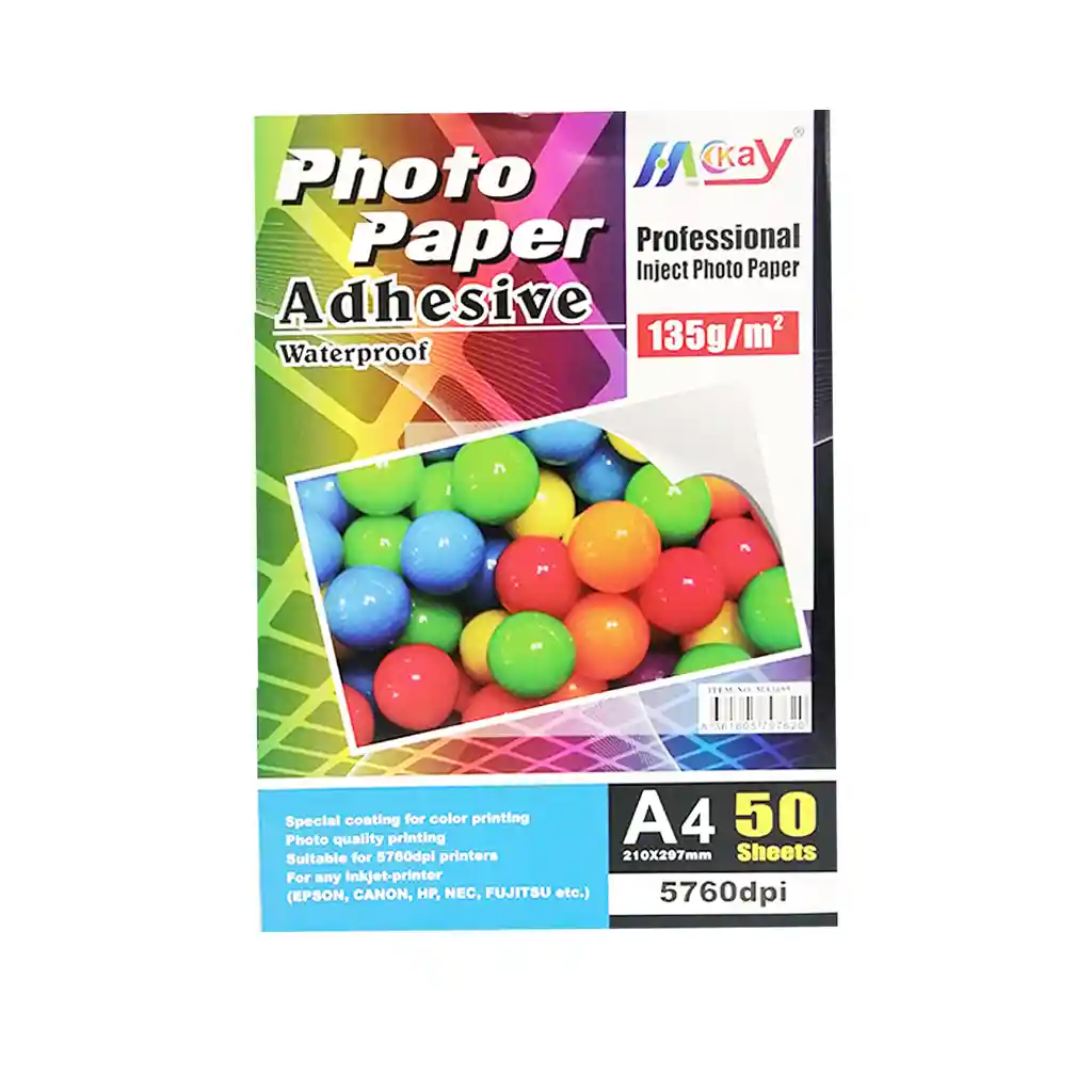Papel Fotográfico Adhesivo Impermeable x 50 Hojas Tamaño A4 Papel blanco brillante ideal para impresoras de inyección de tinta . Recubrimiento especial para impresión en color Impresora de calidad fotográfica. Adecuada para impresoras de 5760dpi para cualquier impresora de inyección de tinta. Excelente calidad para trabajos que requieran un alto grado de elegancia y calidad superior de impresión. Características Formato: tamaño A4 Gramaje: 135 Color: Blanco brillante Textura: liso de alto nivel
