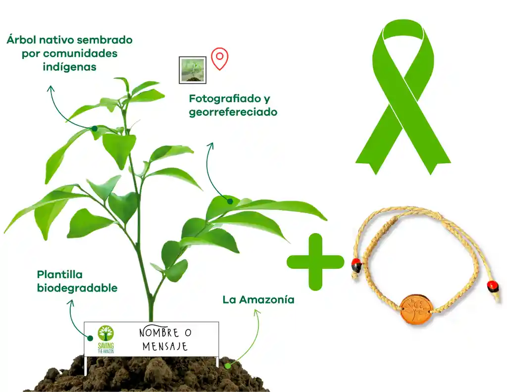 Un árbol sembrado en honor a la memoria de la persona fallecida.La adopción de tu árbol incluye:• Una fotografía del árbol sembrado y marcado con el nombre de la persona homenajeada • Una pulsera tejida por las comunidades indígenas del Amazonas.• Certificado y carta digital de donación con información sobre el árbol y las comunidades que lo sembraron. así como las coordenadas de siembra y su geolocalización.• Además podrás descargar nuestra app para ver la ubicación y fotos actualizadas semestralmente por tres años.• Un único pago por la adopción del árbol y su cuidado por 36 meses.*Una vez realices tu compra nos contactaremos contigo por correo electrónico para solicitarte el nombre y el correo para la marcación y el envío del árbol.