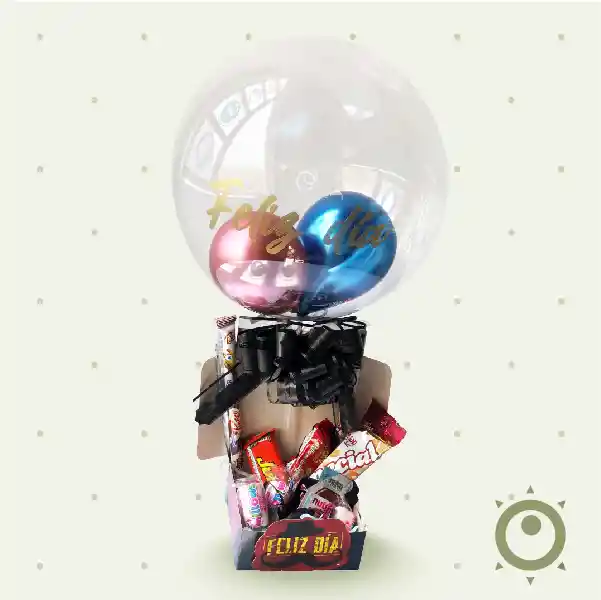 Caja mediana con tapa Papel seda 1 Burbuja pequeña marcada con 2 globos R5 1 Moño grande 1 Mesaje mediano 2 palos Piazza 1 Paquete de mani especial 1 Chocolatina Jet 1 Bom bom italo 1 Nutella pequeña 3 Millows