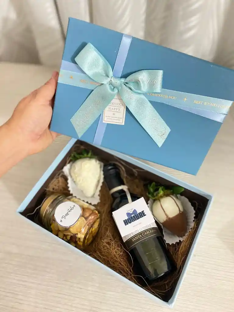 Hermosa caja de Lujo con Vino pequeño, 2 chocofresas y mix de frutos secos.