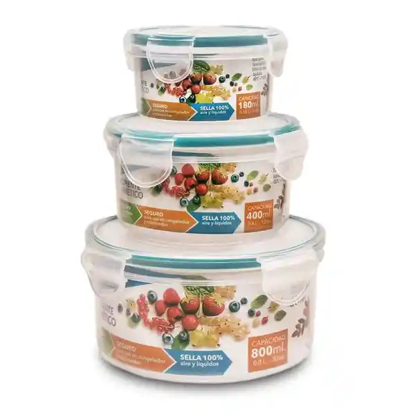 Set Por 3 Unidades. Redondo. Capacidades 180 Ml + 400 Ml + 800 Ml. Cierre de Seguridad. Conserva Durante Más Tiempo. Empaque de Silicona Que Brinda Mayor Resistencia. Higiene y Hermeticidad - Anti Derrames de Líquidos. Producto Anti Hongos Siguiendo Las Recomendaciones de Cuidado y Limpieza. Polipropileno de Primera Calidad. Recipientes Apilables Que Facilitan el Almacenamiento. Libre de Bpa Apto Para el Contacto Con Alimentos. Sella 100 % Aire y Líquido. Apto Para Uso en Refrigeradores. Microondas y Lava Vajillas.