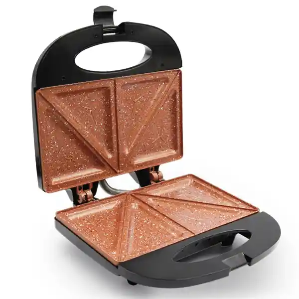 Tipo Piedra + Recubrimiento Cobre Superficie Con Doble Antiadherente. Alarga la Vida Útil de la Sanduchera. Sus Luces Led te Indican el Estado Perfecto de Preparación de Tus Sanduches. ¡Despreocúpate! no Más Alimentos Quemados Cuenta Con un Sistema Regulador de Temperatura. No te Enredes. su Diseño y Tamaño es Perfecto Para Guardar En Cualquier Espacio de tu Cocina. Cuenta Con Portacable Que Facilita su Almacenamiento. Fácil de Limpiar. Gracias a su Antiadherente.