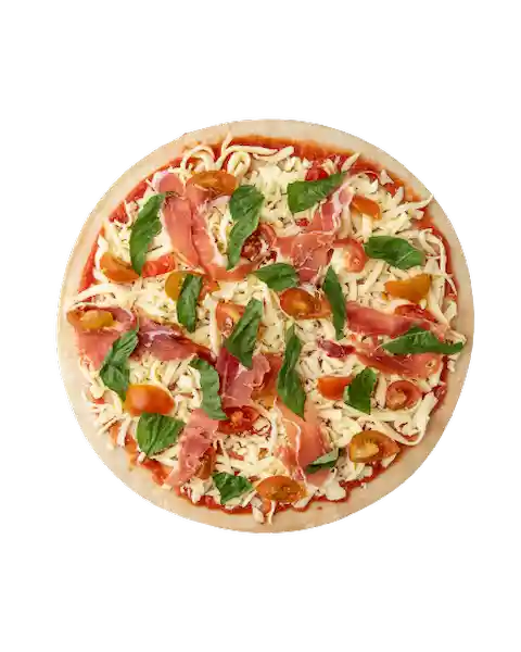 Pizza Personal Para Armar y Hornear en Casa, Masa de la Casa, Salsa Napolitana, Queso Mozzarella, Jamon Serrano, Cherry y Albahaca. Sin Packaging