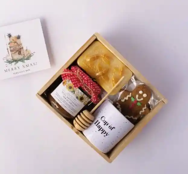 miel artesanal 100% de abejas, Jabon de miel, galletas navideñas, mug 7oz, caja de madera y tarjeta