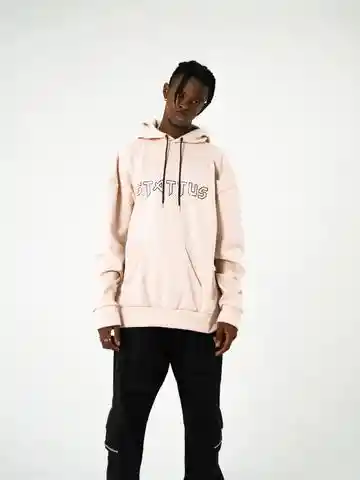 BUZO OVERSIZE CON CAPOTA EN PERCHADO ALGODÓN DE COLOR CAMEL, CON ESTAMPADO EN EL FRENTE.
