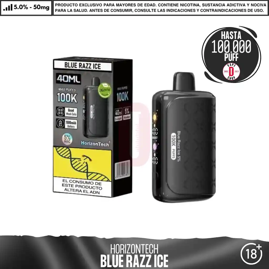 HorizonTech - 100K Puff El HorizonTech 100K Disposable es un vaporizador desechable de ultra alta capacidad lanzado en mayo de 2025. Destaca por ofrecer hasta 100,000 caladas en su modo regular, posicionándose como uno de los dispositivos de mayor duración en el mercado actual. Especificaciones Principales Este dispositivo integra tecnología avanzada para gestionar su gran volumen de e-líquido y potencia: Capacidad de E-líquido Viene precargado con 40 mL de e-líquido al 5% de sales de nicotina. Batería: Cuenta con una batería interna recargable de 1500 mAh que soporta carga rápida de 5V/1.5A mediante USB-C. Sistema de Resistencia: Utiliza bobinas Quad Mesh de 0.8 ohm, diseñadas para mantener un sabor constante y nubes densas durante toda la vida útil del producto. Modos de Potencia: Permite alternar entre un Modo Regular (para máxima duración) y un Modo Boost (para mayor intensidad de vapor). Control de Aire: Incluye un ajuste de flujo de aire continuo (stepless) para personalizar la calada. Pantalla LED: Muestra información en tiempo real sobre el nivel de batería y el estado de las caladas. Ingredientes: Glicerina Vegetal, Propilenglicol, Aromatizantes Naturales y Artificiales, Ácido Benzoico, Nicotina. Advertencia: Contiene nicotina, que puede ser venenoso. Evitar el contacto con la piel y los ojos. No ingerir. Mantener siempre en empaque original y en un ambiente fresco y seco. Mantener alejado de niños y mascotas. No debe utilizarse por Mujeres en estado de embarazo o personas con problemas de respiración como el asma. En caso de accidente contacte a la línea 123. Producto para mayores de 18 años.