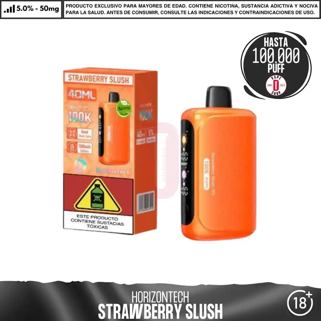 HorizonTech - 100K Puff El HorizonTech 100K Disposable es un vaporizador desechable de ultra alta capacidad lanzado en mayo de 2025. Destaca por ofrecer hasta 100,000 caladas en su modo regular, posicionándose como uno de los dispositivos de mayor duración en el mercado actual. Especificaciones Principales Este dispositivo integra tecnología avanzada para gestionar su gran volumen de e-líquido y potencia: Capacidad de E-líquido Viene precargado con 40 mL de e-líquido al 5% de sales de nicotina. Batería: Cuenta con una batería interna recargable de 1500 mAh que soporta carga rápida de 5V/1.5A mediante USB-C. Sistema de Resistencia: Utiliza bobinas Quad Mesh de 0.8 ohm, diseñadas para mantener un sabor constante y nubes densas durante toda la vida útil del producto. Modos de Potencia: Permite alternar entre un Modo Regular (para máxima duración) y un Modo Boost (para mayor intensidad de vapor). Control de Aire: Incluye un ajuste de flujo de aire continuo (stepless) para personalizar la calada. Pantalla LED: Muestra información en tiempo real sobre el nivel de batería y el estado de las caladas. Ingredientes: Glicerina Vegetal, Propilenglicol, Aromatizantes Naturales y Artificiales, Ácido Benzoico, Nicotina. Advertencia: Contiene nicotina, que puede ser venenoso. Evitar el contacto con la piel y los ojos. No ingerir. Mantener siempre en empaque original y en un ambiente fresco y seco. Mantener alejado de niños y mascotas. No debe utilizarse por Mujeres en estado de embarazo o personas con problemas de respiración como el asma. En caso de accidente contacte a la línea 123. Producto para mayores de 18 años.
