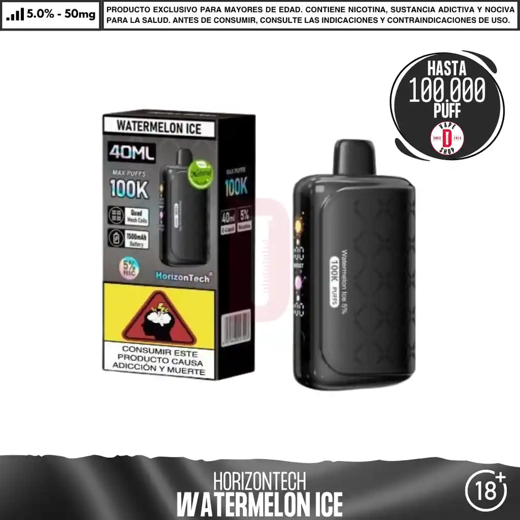 HorizonTech - 100K Puff El HorizonTech 100K Disposable es un vaporizador desechable de ultra alta capacidad lanzado en mayo de 2025. Destaca por ofrecer hasta 100,000 caladas en su modo regular, posicionándose como uno de los dispositivos de mayor duración en el mercado actual. Especificaciones Principales Este dispositivo integra tecnología avanzada para gestionar su gran volumen de e-líquido y potencia: Capacidad de E-líquido Viene precargado con 40 mL de e-líquido al 5% de sales de nicotina. Batería: Cuenta con una batería interna recargable de 1500 mAh que soporta carga rápida de 5V/1.5A mediante USB-C. Sistema de Resistencia: Utiliza bobinas Quad Mesh de 0.8 ohm, diseñadas para mantener un sabor constante y nubes densas durante toda la vida útil del producto. Modos de Potencia: Permite alternar entre un Modo Regular (para máxima duración) y un Modo Boost (para mayor intensidad de vapor). Control de Aire: Incluye un ajuste de flujo de aire continuo (stepless) para personalizar la calada. Pantalla LED: Muestra información en tiempo real sobre el nivel de batería y el estado de las caladas. Ingredientes: Glicerina Vegetal, Propilenglicol, Aromatizantes Naturales y Artificiales, Ácido Benzoico, Nicotina. Advertencia: Contiene nicotina, que puede ser venenoso. Evitar el contacto con la piel y los ojos. No ingerir. Mantener siempre en empaque original y en un ambiente fresco y seco. Mantener alejado de niños y mascotas. No debe utilizarse por Mujeres en estado de embarazo o personas con problemas de respiración como el asma. En caso de accidente contacte a la línea 123. Producto para mayores de 18 años.