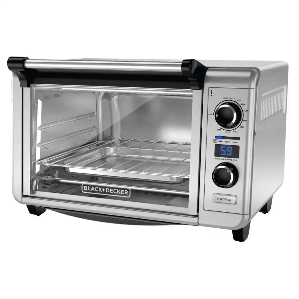 Diseñado para cocinar hasta un 20% más rápido que los modelos anteriores, el Horno Digital de Convección para Mostrador de BLACK+DECKER está construido para complacer. Con espacio interior extenso, puede cocinar fácilmente una pizza de 30 cm (12”) o hasta acomodar seis rebanadas de pan.
