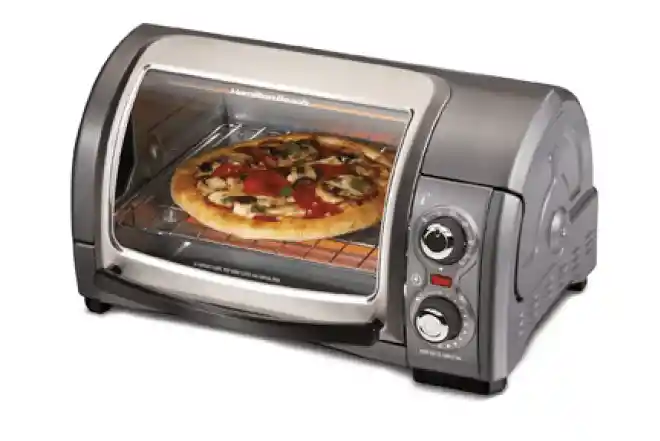 Horno para hornear, asar y tostar con puerta deslizante desmontable para facial acceso y limpieza.Capacidad para 4 rebanadas de pan, temporizador de 30 minutos, bandeja para migas desmontable. Incluye bandeja para hornear y rejilla para asar.