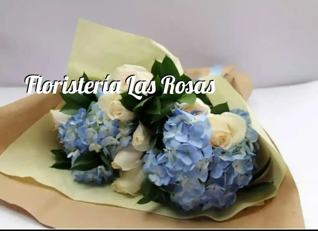 BOUUQET DE HORTENCIAS AZULES ACOMPAÑADAS DE 6 ROSAS BLANCAS FOLLAJE DECORACION MOÑO Y TARJETA