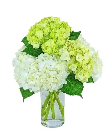 Arreglo de hortensias blancas y verdes en base de vidrio