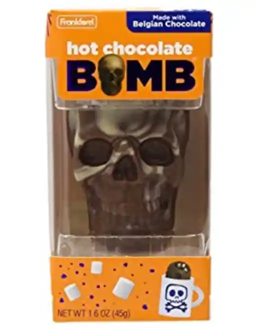 Bomba de chocolate caliente con calavera de Halloween, 1.6 onzas. Esto es tan lindo y está hecho con chocolate belga real. ¡Sumérgete en tu leche o agua caliente favorita y observa cómo la cabeza de calavera explota con malvaviscos!