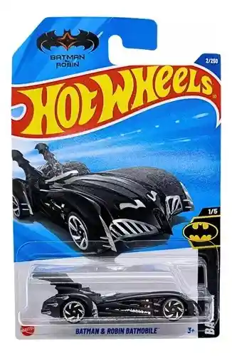 🦇🚘 Hot Wheels Batman y Robin Batmobile – Batman 1/5 (Mattel) ¡Directo desde Gotham City llega el vehículo más emblemático del dúo dinámico! El Hot Wheels Batman y Robin Batmobile es parte de la serie Batman (1 de 5), dedicada a los autos más icónicos de la franquicia. Este espectacular modelo captura el diseño inconfundible del Batimóvil de la película Batman & Robin, lleno de detalles que rinden homenaje al universo DC. ⭐ Características destacadas: Escala 1:64 (~6,5 cm), perfecto para pistas Hot Wheels y colecciones temáticas. Serie Batman, pieza 1 de 5. Diseño fiel al Batmobile visto en la película Batman & Robin, con carrocería estilizada, enormes aletas traseras y detalles futuristas. Colores característicos en negro brillante y detalles en azul translúcido (dependiendo de la edición). Llantas deportivas para lucir genial en cualquier pista Hot Wheels. Fabricado en die-cast (metal) con base plástica resistente. Apto para mayores de 3 años.